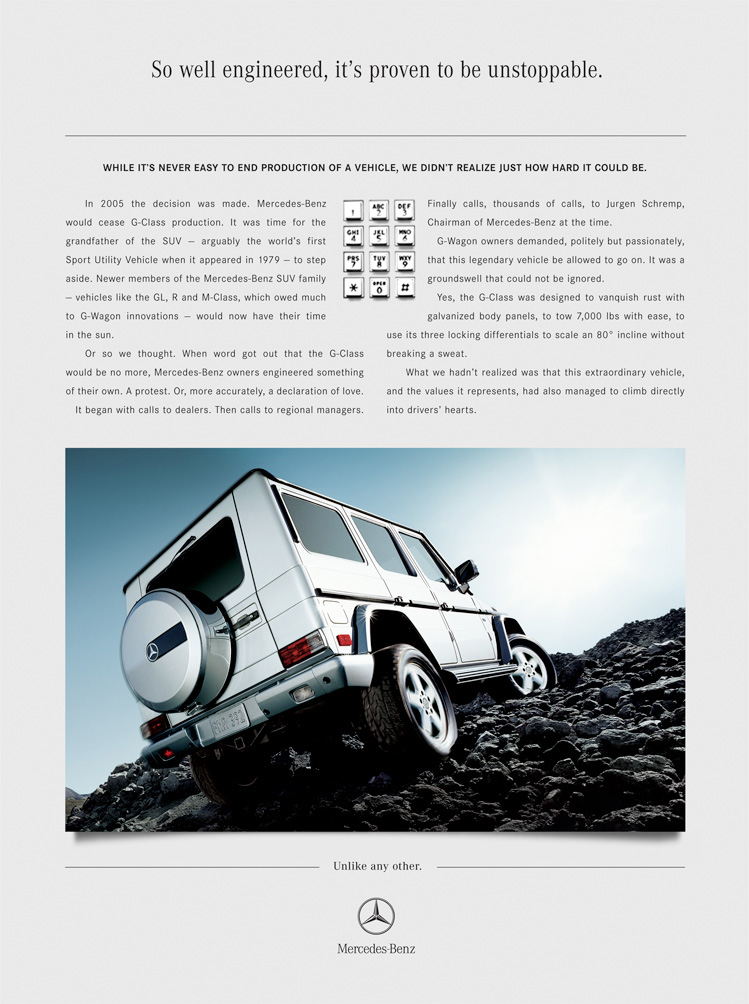 I produced award-winning TV and collateral for Mercedes-Benz, along with quite a bit of print. It became a running joke that at the end of one client presentation I’d walk out, turn around and come back in for the next. But when it came to the quality of the work, and my relationship with the client, hands-on integration performed nearly as well as the automobiles.